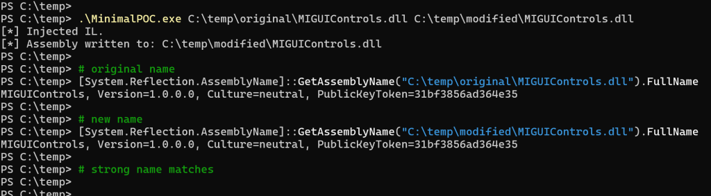 Run this with two arguments: the original (legitimate) file and the output path of the modified assembly. Ignore the third argument for now (that's used later in NIC hijacking). We can see that the strong name is identical for the modified assembly.